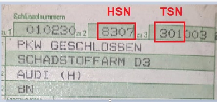 Die ersten drei Werte stehen für das Fahrzeug Modell. Dabei werden Karosserieform, Motorisierung und Kraftstoffenergiequelle (früher: Antriebsart) berücksichtig. Man findet die Typschlüsselnummer (TSN) neben der Herstellerschlüsselnummer (HSN) in der Zulassungsbescheinigung unter dem Punkt 2.2 bzw. im Fahrzeugschein (vor dem 30. September 2005) zu 3.